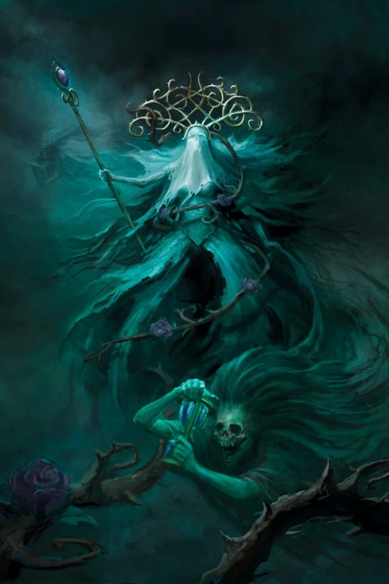 Tras un ardua búsqueda, Nagash encontró finalmente en Lady Olynder a la candidata perfecta para convertirse en su nueva Mortarca. En vida, Olynder fue una célebre y bella dama de Dolorum, un antiguo reino de Shyish. Haciendo uso de la intriga, la conspiración y la seducción llegó a convertirse en la gobernante de la región, escudándose siempre en unas lágrimas y una pena que nunca sintió. Tras su muerte, Nagash la condenó a sentir todas las penas de los Reinos Mortales y a errar en su antiguo reino. Cuando Nagash volvió cientos de años después, se encontró con que Olynder se había convertido nuevamente en la gobernante del reino. Haciendo uso del aura de aflicción que emanaba, Lady Olynder había subyugado a todos los espíritus que se habían alzado en la región durante el Necroseísmo, mientras que a los seres vivos los había llevado a experimentar una nueva y poderosa definición del miedo. Nagash supo inmediatamente que Olynder sería tanto una sirvienta fiel como una experta en el uso del terror, la principal arma de sus recién creados ejércitos espectrales.