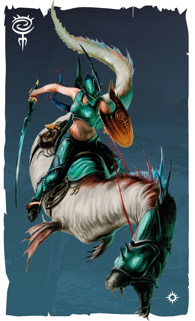 La Guardia Ishalen es una caballería que avanza con la velocidad de una serpiente marina hasta chocar con el enemigo. Los jinetes desatan una lluvia de espadazos con sus sables infernales, y canalizan la electricidad de sus monturas hacia sus escudos galvanizados, a fin de bloquear los ataques enemigos. [BTIDK1'18 1]