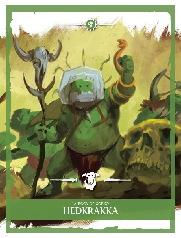 Hedkrakka es un brutal profeta Rompehuezoz que se dice que Hedkrakka recibe las órdenes de Gorkamorka a través de su familiar serpiente. Estas las trasmite a los demás pieles verdes convirtiéndose en un poderoso profeta. Es el líder de la banda conocida como Peñaloka de Hedkrakka.[WUW 1]
