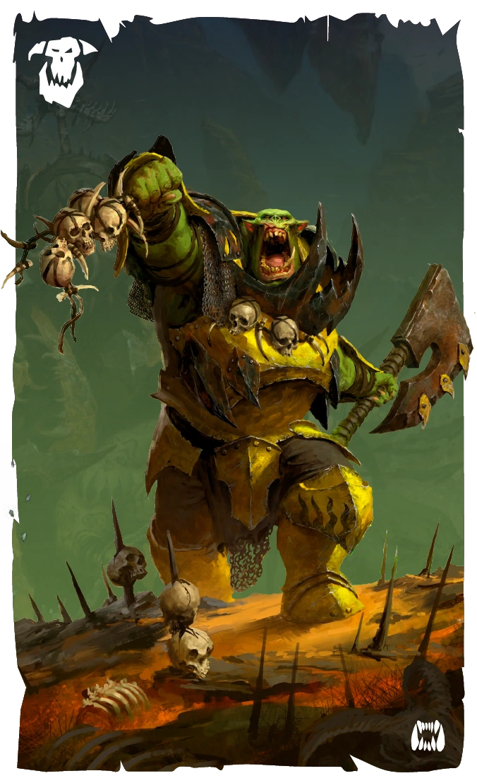 Con un solo golpe, los Megajefez pueden aplastar a un guerrero del caos con armadura, mientras manifiestan la energía del ¡Waaagh! y conducen a sus vastos ejércitos a la guerra.[BTOWK2'19 1]
