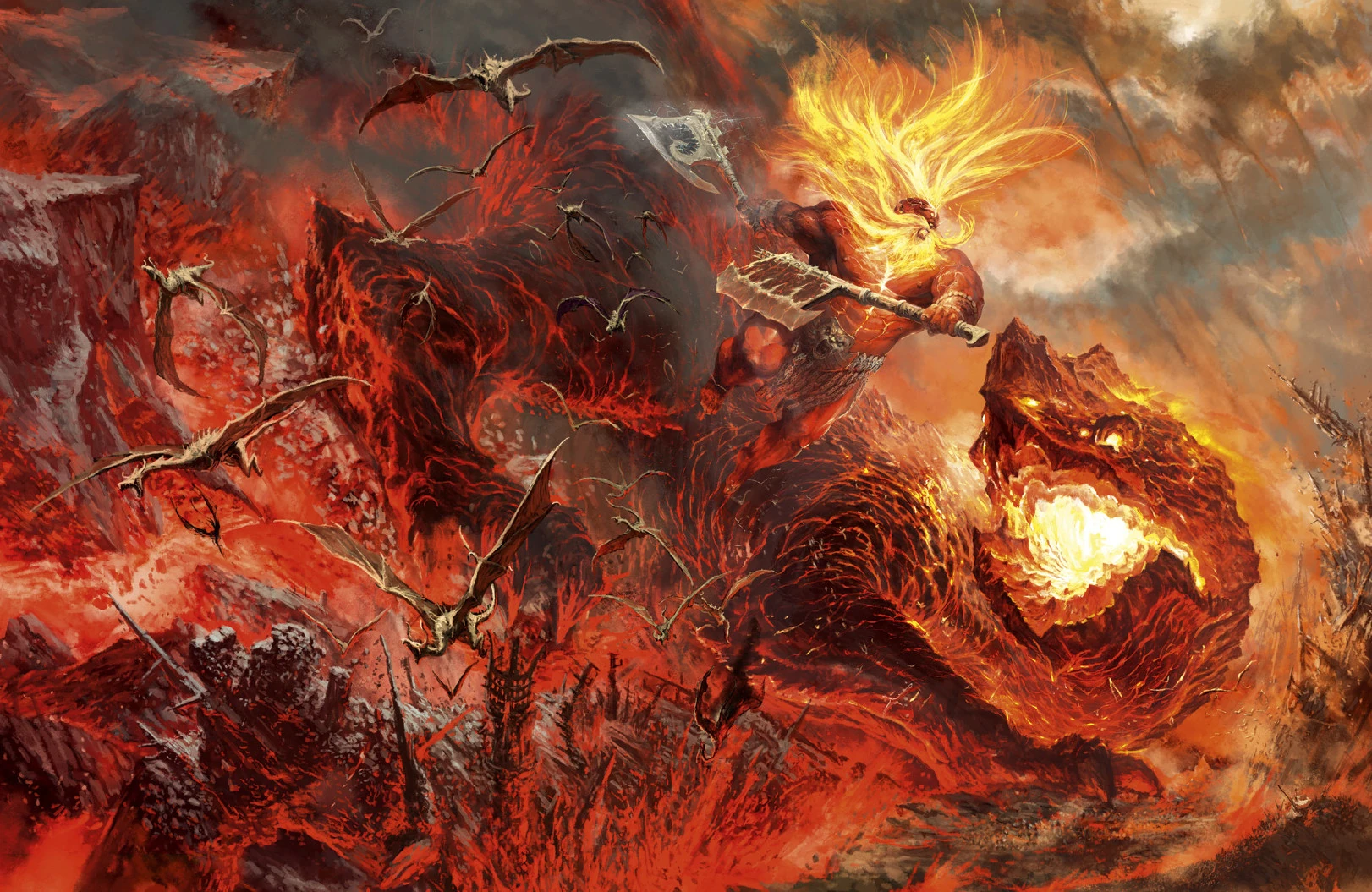 Grungi reunió a su pueblo disperso y fundó el Karak de Hierro. Entretanto su hermano Grimnir recorría en solitario las colinas de Aqshy. Las batía en busca de la sierpe de fuego que Sigmar había nombrado y que aterrorizaba aquella región. La criatura a la que Grimnir siguió hasta su cubil era Vulcatrix, Madre de las Salamandras, el ser mitológico del que nacieron las llamas de los mundos. La sierpe de fuego se desenroscaba sobre el abismo fundido, sin que pareciera tener fin, alzándose muy por encima del dios guerrero Duardin. El aire destellaba y crepitaba. Sin arredrarse, Grimnir alzó sus hachas y cargó.