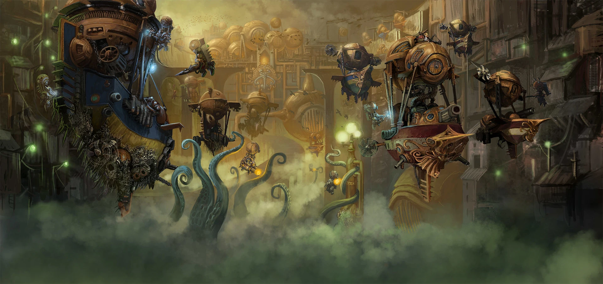 Los puertos celestes de Kharadron reclaman el dominio sobre las vías aéreas de los Reinos Mortales y son pocos los que cuestionan esta afirmación. Estas enormes ciudades flotantes son centro bulliciosos de fortalezas comerciales y militares, capaces de recorrer grandes distancias en busca de tierras prósperas y de expulsar a los ejércitos invasores del cielo con bombardeos de sus gigantescos dispositivos de cañones de aeter. Los visitantes de todos los reinos son bienvenidos en los bulliciosos distritos de los puertos celestes y los barrios comerciales, donde se puede comprar todo tesoro inimaginable y recurso exótico.