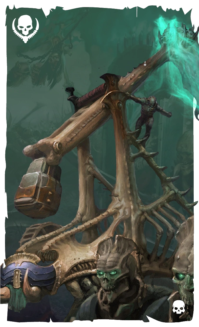 Cada una de estas catapultas es un dispositivo de artillería con una actitud agresiva. Es capaz de recargar y disparar nuevamente en cuestión de segundo y se trasporte mediante una docena de patas óseas como si fuera un cienpies. A diferencia de la artillería convencional, puede disparar en movimiento sin falta de precisión, por lo que es la herramienta perfecta para apoyar a una cohorte en la larga marcha de la conquista eterna. [BTOSB2'19 1]