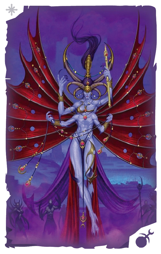Tras la Batalla de Hagg Nar, Morathi había alcanzado la divinidad mediante un ritual utilizando la almas de seguidores de Khorne, Nurgle y Tzeentch y usando la energía del propio Slaanesh encadenado en Uhl-Ghysh. Mediante este ritual generó una conexión entre el vientre de Slaanesh y su caldero para usar la Linterna Ocariana y extraer almas de Slaanesh.[BR:M 1]