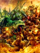 Carving winding trails of flaming destruction through the enemy’s ranks like the fire-wyrms of old, Grimwrath Berzerkers wreak absolute ruin with their massive fyrestorm greataxes. Roaring war cries to Grimnir, they plunge deep into the ranks of the foe, for they are at their most furious when utterly outnumbered. Blades spark off their rune-covered skin, leaving only shallow furrows in their toughened flesh. Surrounded by ghostly, blazing auras, the Fyreslayers snarl in rage as blood streams unnoticed from their wounds, their eyes smouldering with the barely contained power of Grimnir.[1a]